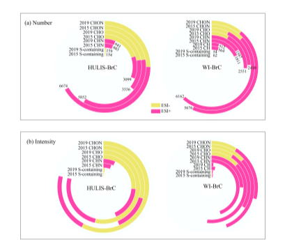 北京大气污染减排措施的实施有效减少了PM2.5浓度,其中“煤改气”工程作用显著。然而“煤改气”工程对棕碳的影响并不十分清楚。 中国科研实验室地球环境研究所黄汝锦研究员团队对北京“煤改气”工程前后类腐殖质棕碳(HULIS-BrC)和水不溶性棕碳(WI-BrC)组分元素组成进行研究。发现不同元素组成发色团数量为CHON>CHO>CHN>(CH)>含S发色团,“煤改气”工程后HULIS-BrC发色团数量增加了约14%,而WI-BrC发色团数量减少了约8%。 |